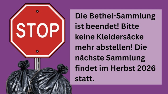 Die Bethel-Sammlung ist beendet! Bitte stellen sie keine Kleidersäcke mehr an unseren Sammelpunkten ab! Die nächste Sammlung erfolgt im Herbst 2026.