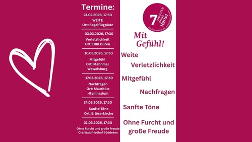 Herzliche Einladung zur Fastenaktion 7 Wochen ohne Härte mit Gefühl. Jeden Dienstag um 17:30 Uhr an verschiedenen Orten in Büren zu verschiedenen Themen.